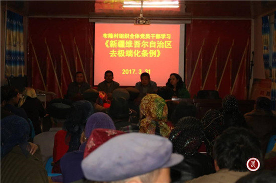 拜城县发改委驻托克逊乡布隆村“访惠聚”工作队立即组织村“两委”班子、村民小组长、副小组长以及党员、“四老”人员,集中在村党支部会议室,就《新疆维吾尔自治区去极端化条例》进行大学习、大讨论,引导各族干部群众牢固树立去极端化思想,自觉抵制和反对极端化,全力维护社会稳定和长治久安。