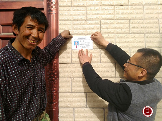 图二:工作队队员与农民群众一起将“连心卡”贴在农家院里