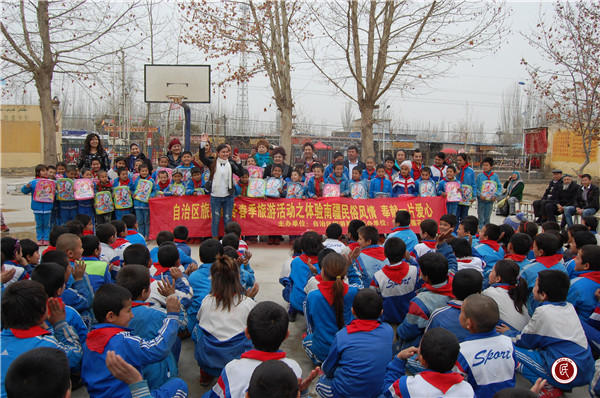 新疆民生网叶城讯(通讯员 吴勇 岳伟群)奉献爱心,收获希望。近日,叶城县旅游局驻加依提勒克乡苏勒坦艾日克村工作队在了解到苏勒坦艾日克小学部分学生学习用品严重不足这一实际后,积极与乌鲁木齐雪莲花国际旅行社沟通对接,联合举办了“情系教育、奉献爱心”活动,当旅游观光团队成员听到苏勒坦艾日克小学学生学习用品方面的困难后,得到了队员的热情响应,积极参加到活动中来送温暖、献爱心。