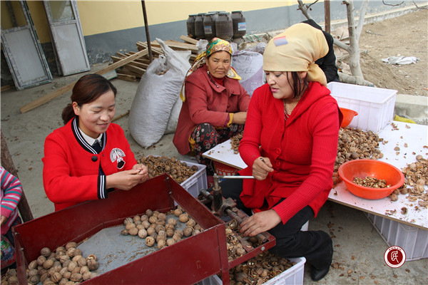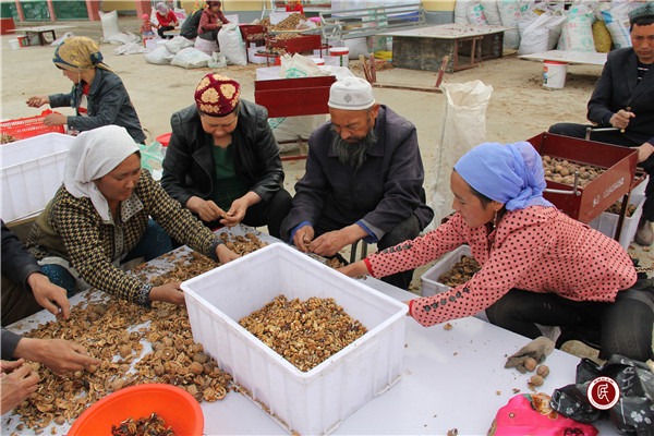 村民祖丽胡玛·艾山每天都会抽空来村委会剥核桃,她不住地为工作队点赞:“工作队播种希望,我们收获希望。工作队不挣我们的一分钱,为我们办的好事看在眼里,记在心里,真是我们的贴心人。”