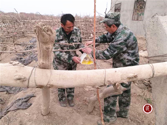 新疆民生网讯 为切实将“学讲话、转作风、促落实”专项教育活动引向深入,促进党员干部作风转变,密切党群干群关系,推动葡萄病虫害防治工作,3月29日,吐鲁番市高昌区农机局驻三堡乡阿瓦提村“访惠聚”工作队组织队员前往葡萄地协助农民群众悬挂“三角形诱捕器”,并将诱捕器编号,实名登记悬挂户主,确保悬挂工作扎实有效,经得起检验;现场指导村民葡萄病虫害防治喷药机械化技术。