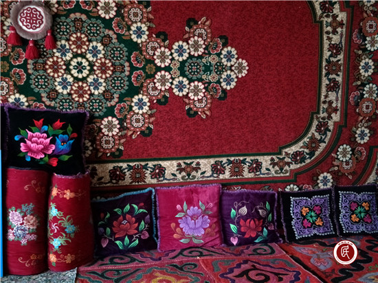 随着走访入户的开始,我和我的队友被每家每户精美的刺绣深深的吸引,少数民族刺绣不仅花式多种多样,而且少数民族的手工艺品还反映了其特有的民族特色,枕套、罩单、坐垫、花毡、隔热的餐垫杯垫,全部都出自家中女主人之手。据了解,生活在这里的哈萨克族妇女都有娴熟的刺绣手艺,刺绣的图案以对称型几何图形、植物的枝蔓、自然景物等为内容,其表现形式多姿多彩,图案类型和内涵非常丰富,充分诠释了聪慧爱美的哈萨克族人对美的不断追求。