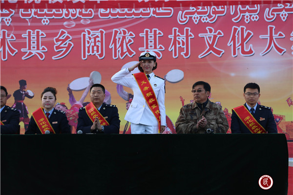这是什么情况了?原来驻村工作队结合全国税收宣传月,联合阿克苏地区国税局共同邀请了阿克苏籍维吾尔族退役女兵科比努尔来村里参加升国旗仪式,同时结合习近平总书记参加十二届全国人大五次会议新疆代表团审议时的重要讲话精神和税收宣传月向群众宣讲。900余名各族群众迎着春日的第一缕阳光,就是为了尽早一睹辽宁舰退役女兵的飒爽英姿。