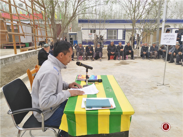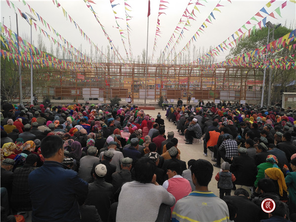 “从土坯茅屋到安居房,从沙土飞扬的乡间路到联村通县的柏油道,家家田地邻渠,户户通水有电,这些都是我们党中央的关怀和恩情啊!”阿布都吉力力从近年来家乡的发展变化讲到党的惠民富民政策,从极端思想对家庭的荼毒讲到暴恐对大家生产生活造成的影响。他呼吁大家知党恩感党恩,不忘党的恩情,美好的生活需要大家凭借勤劳的双手、智慧的头脑来共同创造,同时也需要大家辨明是非,远离宗教极端思想,不被用心险恶的人所蛊惑,保护来之不易的团结之花、幸福之果,共同维护家乡的稳定。阿布都吉力力语言朴素却又深入人心,句句真诚,声声殷切,村民们认真聆听并多次报以热烈的掌声。