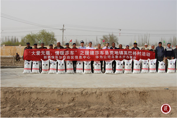 今年年初,华为技术有限公司得知自治区信息中心驻村工作点英巴格村属扶贫重点村后,积极与中心领导沟通有关援建事宜。中心领导安排驻村工作队与华为技术有限公司联系,援建村里最急需的物资。 此次活动,华为技术有限公司为村里捐献了35000元的化肥,20套文艺队演出服、30套体育队的运动服及篮球排球、一台价值5000元的电动车和100个书包。
