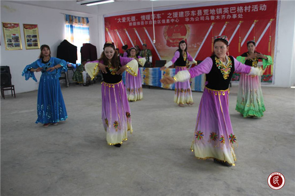 工作队袁学海队长与村党支部书记塔里普·亚森代表全体村民为华为技术有限公司赠送了“扶贫济困促发展、真情实意献爱心”的锦旗。随后,村里的文艺队进行了精彩的文艺表演,并为华为一行嘉宾赠送了维吾尔族花帽。
