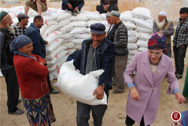 捐赠仪式结束后,村民纷纷来到村委大院领取企业捐赠的化肥,喜悦激动地心情溢于言表。村民艾合买提江·玉努斯激动地说,现在开始春耕了,地里最缺的就是化肥,工作队联系企业为我们捐赠了化肥,解了我们燃眉之急,另外还给我们捐献了很多的文体用品,丰富我们的业余文化生活,工作队拜克亚克西。随后,他唱着“没有共产党就没有新中国”,开着电动车,载着化肥兴高采烈的回家了。