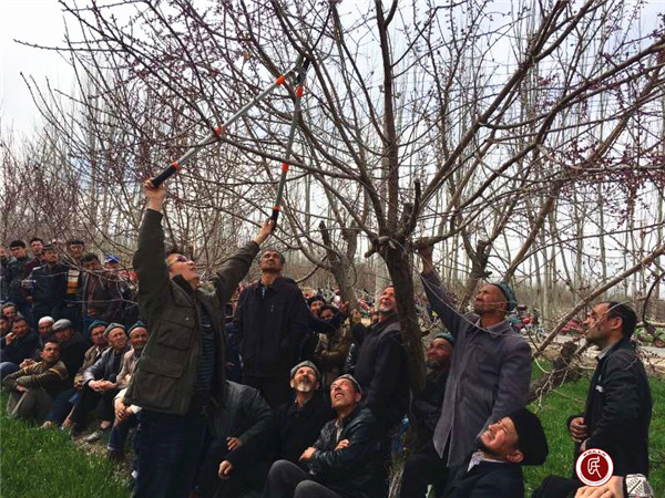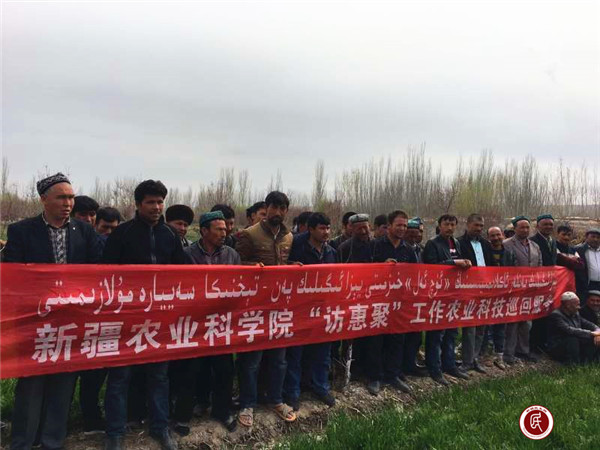 新疆民生网讯 (通讯员 吴疆平)3月31日,自治区纪委监察厅“访惠聚”驻阿克陶县巴仁乡古勒巴格村工作队携手自治区农科院农业科技巡回服务队把培训课堂搬到田间地头,现场“把脉开方”,为村民提供手把手、面对面的技术服务,补科技之钙,助力春耕生产。