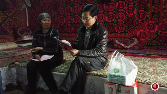 新疆民生网讯 (通讯员 陈虹秀)诺鲁孜节刚刚过去没几天,玛纳斯县交通运输局、治蝗站驻北五岔镇黑沙窝村工作队队员们带着吾布力喀斯木•买吐送发表的《致维吾尔族同胞觉醒书》、“两会精神”、惠农政策宣传单和满怀心意的慰问品再次来到队长徐自虎的结亲对象吾马尔别克一家进行走访慰问。
