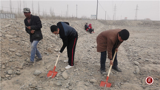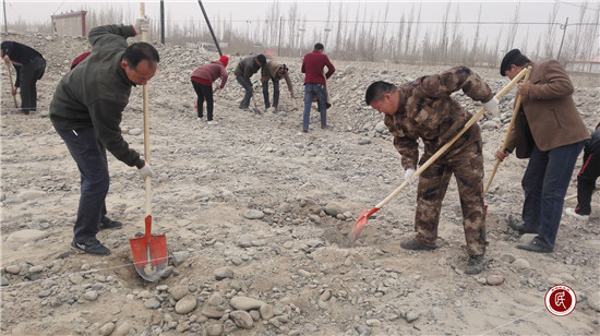 新疆民生网讯 (通讯员 路彬)“赶紧走,老百姓已经到达植树现场了,我们也不能落后。”4月8日,巴州统计局驻且末县库拉木勒克乡其木布拉克村“访惠聚”驻村工作队全体成员扛着铁锹奔赴植树现场,全村参加此次义务植树活动的群众达到100余人,植树劳动将持续3天。