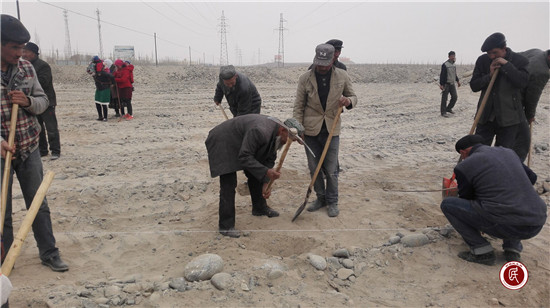 植树过程中,工作队成员与村民们干劲十足,放眼望去,处处呈现出一片热火朝天的劳动场景,大家各司其职、配合默契,有的量距离、有的挖树坑、有的铲石块、有的搬树苗。不管干部还是群众都不怕苦不怕累,每逢遇到大石块,拿十字镐的群众都会主动来刨挖。大家边拉家常边挖树坑,你一铲我一镐,不到2小时就在2亩多的戈壁荒滩上挖出600多个整齐的树坑。