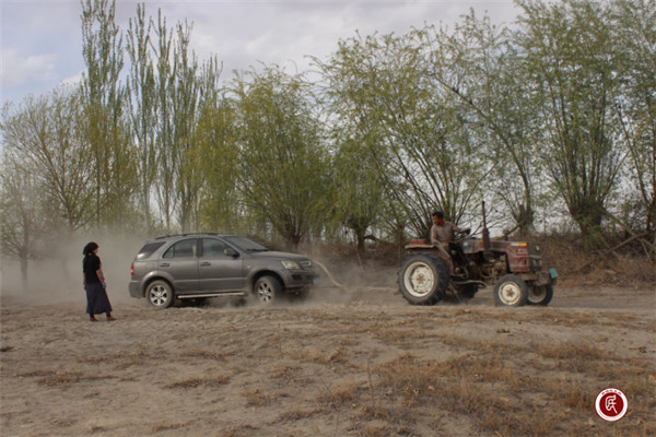 “你们不要着急,我再去找点工具。”村民一边比划一边用维语跟我们说。他把拖拉机停在了地边,卸下了打药桶,一路小跑从家里找来一根铁链,又叫来了地里干活的妻子帮忙。然后趴在地上用铁锨把车轮胎附近的沙子铲出,系上铁链用拖拉机拽,几个队员在后面推。经过40多分钟的奋战,车子终于被拖到了坚实的路面上。