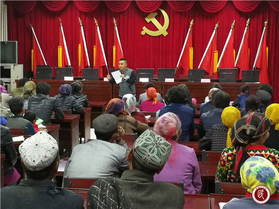 兼任国语课老师的队员走上讲台,教村民们学习简单的日常对话“你好!我叫阿里木,我家有三口人,我家在二小队,我找你们有点事”。这是工作队在教村民们每星期必学的5句国语课程,老师耐心细致的一字一句悉心授课,村民们专心致志,大声的跟声学说。师生们互动交流,不时地请学生对话,引来了阵阵掌声和欢笑声。