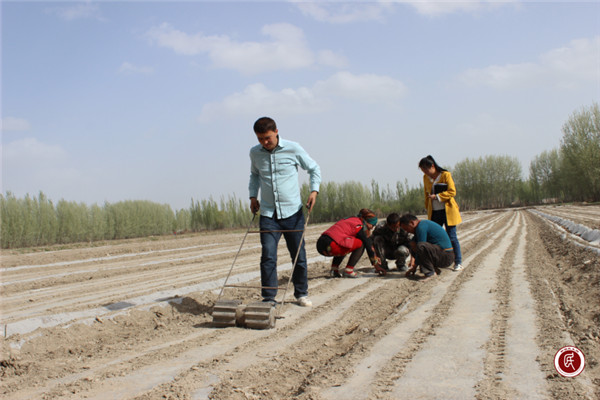 “前几天村里下了一场春雨,现在村里大部分棉花地都结板块了,现在我正用自己发明的‘转轮’把结块地碾碎,这样有利于棉花种子生长出来。”萨依干买里村村民艾力克·阿布都外力说。