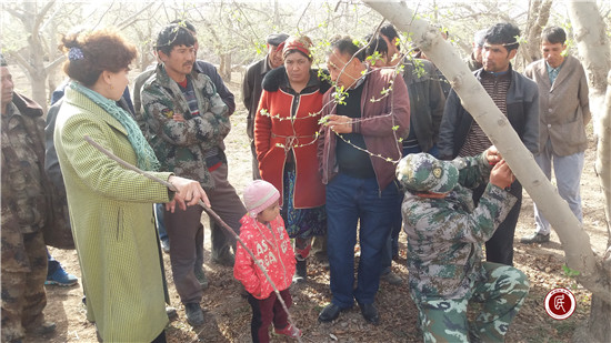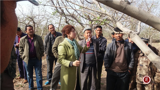 新疆民生网讯 (通讯员 言林、韩采霞)“谢谢你,言队长,你们讲的一次比一次好。”“只要你们觉得受益,我们工作队做什么都是值得的。”这是阿克苏市人大、科技局、科协驻红旗社区工作队邀请市林业局高级工程师努尔尼沙·吾休尔讲解苹果的修剪、病虫害防治以及花期授粉后,艾斯卡尔·喀斯木村民激动的拉着工作队队长的手说。