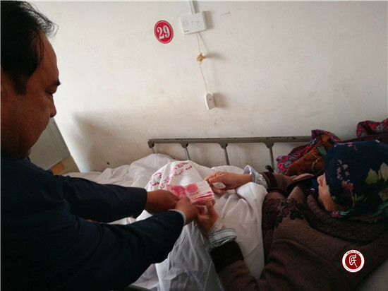 新疆民生网讯 (通讯员  徐大伟  买买提江·玉素甫 )2017年4月9日上午,当阿克苏市依干其村(社区)联合党委第一书记、潞新公司“访惠聚”驻依干其村工作队队长吾斯满·玉素甫将6100元钱交给躺在病床上的孤寡老人吐拉汉·吾秀的手里时,老人家感动得老泪纵横,连声说:“感谢党组织的恩情,没有你们的关怀和帮助,我这把老身子骨早就撑不住了……”