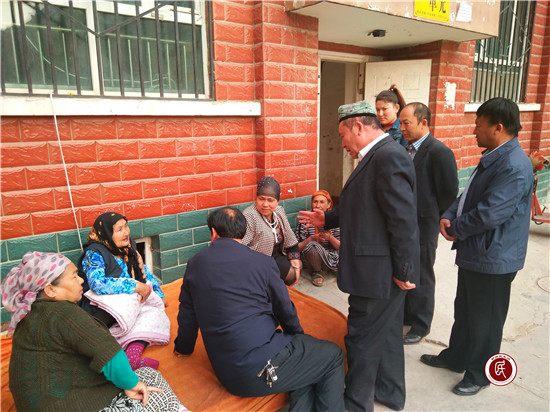 图2、村“两委”一班人在安慰孤寡老人古汉尼沙•亚森
