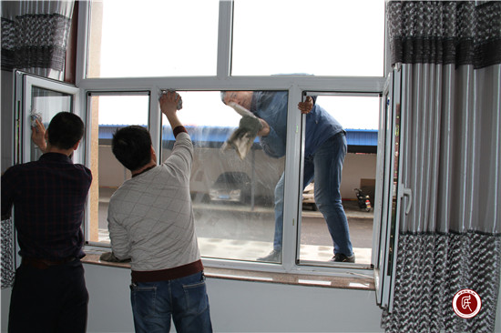 经过一个冬天的风吹雪打,好不容易开春了,村文化中心也需要“洗洗脸了”。全体人员按照分工分散在大楼的各个楼层,只见擦玻璃的、打水的、扫地的,各处都是一片繁忙景象。经过一天的努力,大家的衣服上、脸上糊脏了,浑身劳累,但村文化中心干净整洁了,一扇扇窗户光洁透亮,大家的脸上露出了笑容。