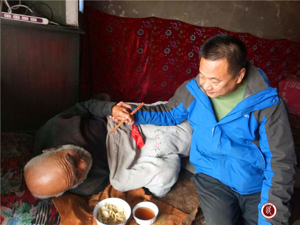 到老党员吾布力塔里甫·艾沙家中时,发现老人因患病已经卧床一段时间了,看见他费力的用筷子夹着饭菜,我接过老人手中的筷子,喂他吃饭。老人眼含热泪激动地说:“我是79年入党的老党员,这么冷的天你们还来看我,感谢党和驻村工作队对我生活上的关心和照顾,党就像我的亲人一样,我永远热爱党。”随后我们进一步了解了他的病情,为他讲解了一下与他相关的医疗惠民政策,为他咨询了相关的医疗单位,及时解决了他眼前的困难。