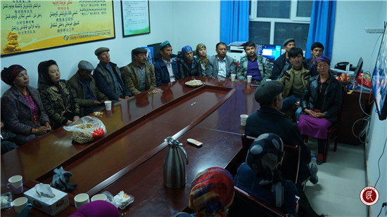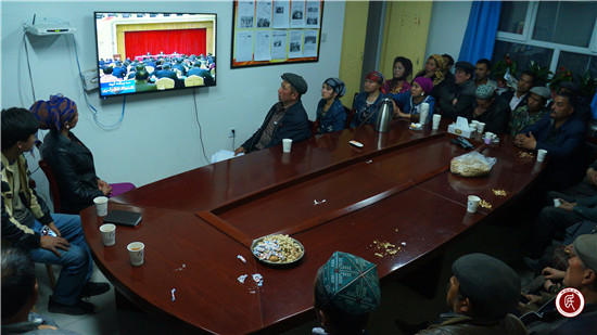 ——国家统计局新疆调查总队驻苏盖特力克村工作队与村民一起收看“自治区民族团结进步座谈会”