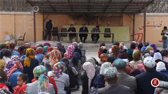 新疆民生网讯 (通讯员 田泽玥、张昊、张贝)为进一步宣传新疆维吾尔自治区第十四个“宪法法律宣传月”。切实推进苏盖特力克村普法工作,落实苏盖特力克村维稳主体责任,4月13日,国家统计局新疆调查总队驻乌什县奥特贝希乡苏盖特力克村工作队会同村“两委”召开苏盖特力克村“去极端化”主题宣讲活动,全村1200余人集中在村委会大院认真聆听了宣讲。