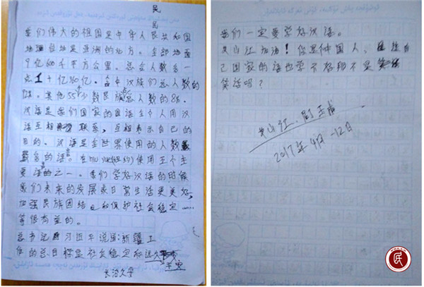 23岁的艾山江﹒阿玉甫带着怀孕7个月的老婆依那外提·麦麦提吐尔孙一起来学国语。艾山江在练习本上写道:“我们学好汉语的时候,我们未来的发展或(和)日常生活(会)更美好……我们一定要学好汉语。艾山江加油!你是中国人,连自己国家的语(言)也学不好,那不是笑话吗?”虽然各别语句不是很通顺,但字里行间着实让人动容!
