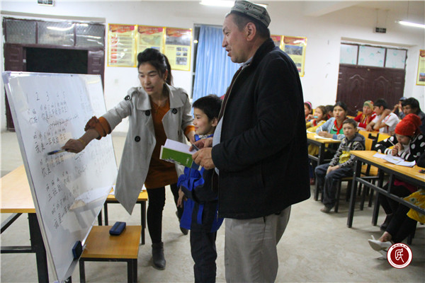 8岁的女儿依巴代提·努尔艾力带着43岁的爸爸努尔艾力·艾麦提一起来培训班学国语。依巴代提说:爸爸,咱们比一比!