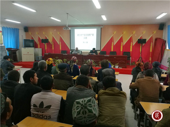 4月10日升国旗仪式结束后,包村乡领导木合塔尔·沙吾提、村两委班子成员、团支部书记西尔艾力、村两委班子成员艾萨江.艾买尔、工作队副队长木塔立甫·米吉提结合各自的工作实际,从《新疆维吾尔自治区去极端化条例》、自治区关于关怀青少年的特殊扶持政策、农村农业补贴、农村农田水利项目、农村村村通油路项目、太阳能路等项目、工作队多方筹措资金为村民致富、讲述了吾布力卡斯木·买吐送同志的心声等方面进行了详细的解说,让村民切实感受到党的惠在何处、恩在哪里,让村民明白是党的好政策让他们过上了幸福生活。