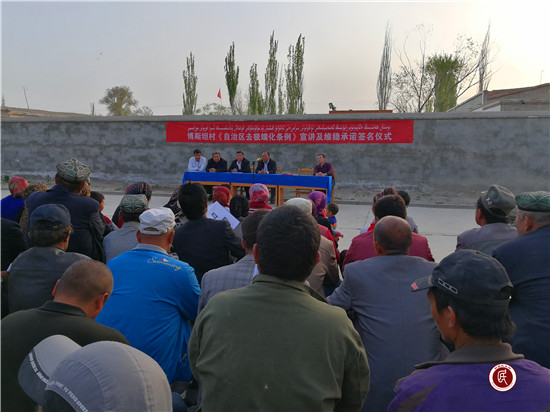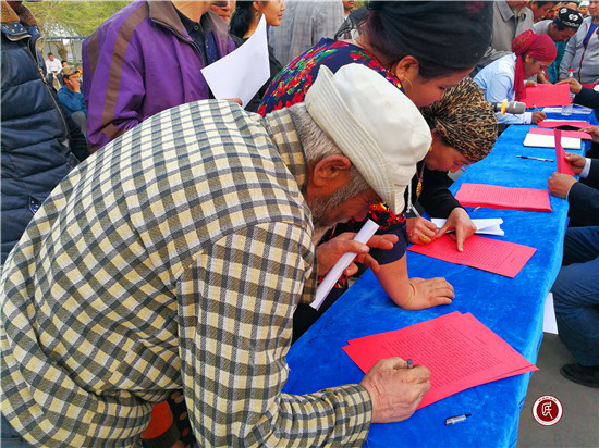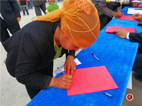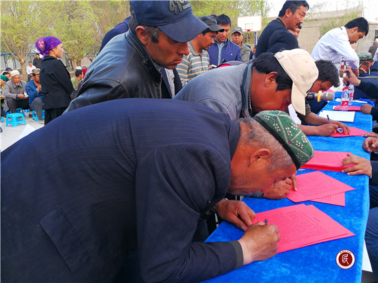 新疆民生网讯 (通讯员 秦有明)“为维护博斯坦村社会稳定和长治久安,本人特作庄重承诺:保证本人、家庭成员和亲属不参与非法宗教活动、远离极端宗教思想,不穿吉里巴甫服饰、不蒙面,不收听、收看和传播非法反动宣传品,不在互联网等新兴媒体上传下载、制作传播有害信息和非法反动内容,自觉维护民族团结……”4月12日的下午,一声声激昂的承诺声响彻阿瓦提县博斯坦村大队部上空。