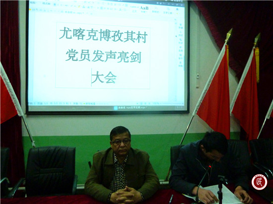 据悉,阿克苏市教育局工作队今晚组织该村全体党员,认真学习《致维吾尔族同胞觉醒书》,该村48岁的村党员木塔力甫·买买提代表全体党员首先发声亮剑,他激动地说:“我是本村土生土长的农民,是新农村发展变化的见证者,也是在共产党领导下获得惠农政策最多的受益者。现在家里生活条件越来越好了,孩子在广东肇庆上中专,条件很好,学校对我们少数民族学生特别关心,自己不用掏学费,吃住全部免费,还经常组织学生外出游览,开了阔眼界,增长了知识,寒暑假还派专人来回接送,好处说也说不完,道也道不尽,这一切都是党的关怀的结果。我一定要督促好我的孩子,好好学习,遵纪守法,将来成为一个对祖国建设有用的人,用自己的智慧建设美丽的家乡,为社会多做贡献,用实际行动回报党中央的关怀,共同维护社会稳定。”在场的所有党员纷纷表示,坚定坚决与 “三股势力”斗争到底,共同维护新疆的团结稳定,建设美好家园。