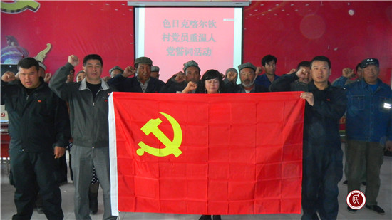 新疆民生网讯 (通讯员 郭永明)4月14日,阿克苏市农业局驻喀拉塔勒镇色日克喀尔钦村工作队为进一步强化党的观念,增强党员意识,自觉遵守党的纪律,确保做一名合格的共产党员。38名党员佩戴党徽,参加重温入党誓词活动。