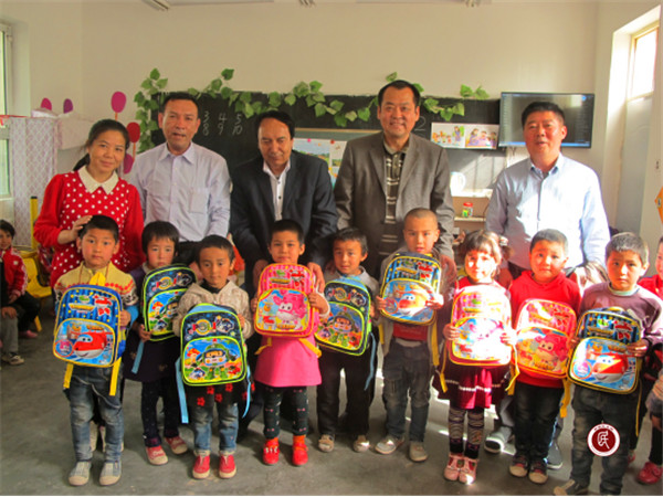 图片说明:图为慰问组一行与支教老师、孩子们合影。