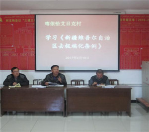 第一书记李云仁在学习前说道:“之所以组织大家对《新疆维吾尔自治区去极端化条例》进行再学习,就是要让大家切实领会《条例》精髓,切实用《条例》指导实践、指导工作,基层工作涉及面广,情况复杂,没有指导性的法规文件作遵循,往往形成不了高度统一的工作合力,在当前形势和背景下,自治区党委出台并实施了《新疆维吾尔自治区去极端化条例》,非常及时,具有深远战略卓见,给我们基层做好‘去极端化’工作提供了有力的遵循和依据,可以说是我们基层各级工作队的指路明灯,所以我们一定要全面的学、系统的学、深入的学,切实掌握好《条例》这个‘法宝’,才能让我们的工作更加规范,更加有序,更加有效。”