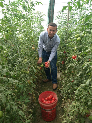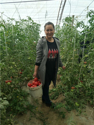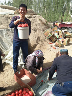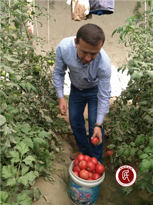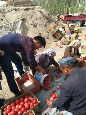 工作组成员先联系县上收购西红柿的商贩,商贩很快就到了大棚,然后与商贩商量价钱,最终以75元一箱商量好收购价格,工作组的成员们一个个争先恐后的拿起盛西红柿的工具,深入大棚去“淘宝”。大家干的热火朝天,虽是四月天,但大家却是满头大汗,男干部都把上衣甩在一边,你摘我抗。两个多小时过去了,大家共摘得18箱西红柿,在把西红柿装上车之后,农妇接到1800余元西红柿售卖款时,她眼里充满感激:“共产党亚克西,谢谢你们,如果不是你们帮忙,我们家这1亩多的西红柿我一个人一天也是摘不完的。”