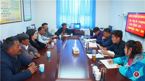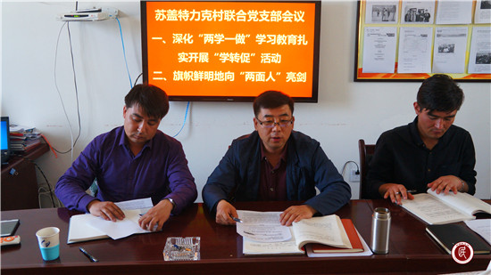 新疆民生网讯 (通讯员  张昊、田泽玥、张贝)为全面贯彻落实自治区在“两学一做”学习教育中开展“学讲话、转作风、促落实”专项活动的部署要求,4月14日,苏盖特力克村联合党支部召开支部委员会议,会议由苏盖特力克村联合党支部书记王伟主持,国家统计局新疆调查总队驻苏盖特力克村工作队、村“两委”等联合党支部委员和党员代表参加会议。