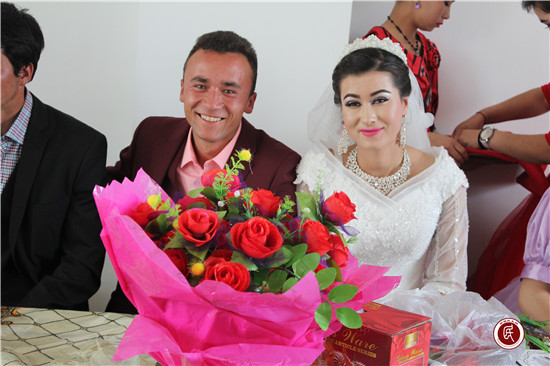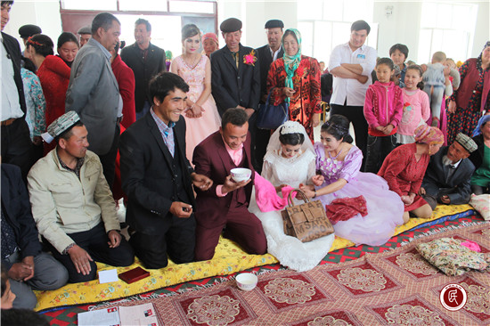 说起这场婚礼,还有一段小故事:新娘名叫古力布斯旦·托合提,父亲托合提·买提尼亚孜是萨提村3小队村民,爱喝酒,喝醉后什么事都不管不顾,工作队和村干部了解到这个情况后,多次到家中,苦口婆心对他进行教育,在得知家里马上要给女儿操办婚事的消息后,决定由村委会来主持操办,既简朴隆重,又有纪念意义。托合提·买提尼亚孜感念工作队和村干部的一片苦心,立誓改掉恶习,并说服女儿取消了已经在镇上大巴扎餐厅预约的酒席,改在村委会举办婚礼,让乡亲们在春耕生产之余,借着女儿的婚礼热闹热闹。