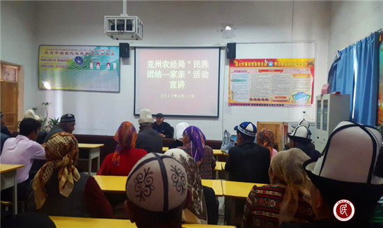 克州农经局党支部书记阿布都热合曼·阿布都卡地尔对村委会群众讲民族团结故事,用鲜活的事例,讲述了民族团结是人人都要像爱护自己的眼睛一样爱护民族团结,像珍惜自己的生命一样珍惜民族团结,自觉维护民族团结,坚决维护社会稳定的社会氛围。