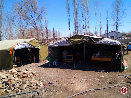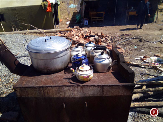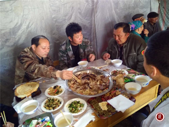 工作队员坐在帐篷里开席了