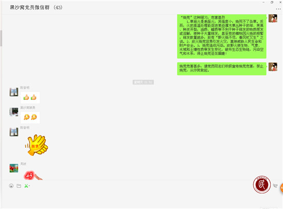 二是充分利用集体活动广泛宣传。在近期开展的周一升旗、党员学习、植树造林等一系列集体活动中,工作队将事先在网上下载的烧荒危害案例发放给大家一起学习。同时,用身边人讲述身边事的现身说法来引起大家对禁止烧荒的共鸣。
