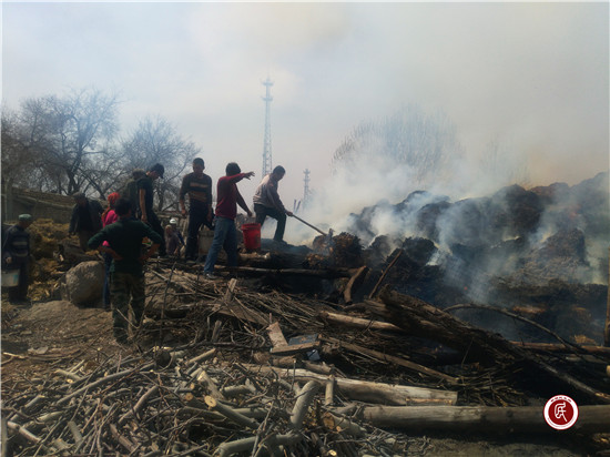 4月16日中午午13时左右,艾斯卡尔·买买提家里的一栋羊圈与草垛发生火灾,火势正快速蔓延到另一栋羊圈,火苗越蹿越高,羊圈即将被火苗吞噬。工作队立刻组织民警、党员及村民进行救火,将火势的蔓延路线截断,设置出隔离带,及时清理出易燃物品。周边闻讯赶来的村民纷纷投入到灭火中,有的从附近村民家中连接水管,有的提着桶、端着盆到附近水渠中引水扑火。滚滚浓烟扑面而来,呛得人连连咳嗽。由于组织得当、灭火及时,火情及时得到有效控制,没有人员受伤。经过2个多小时的努力扑救,调来铲车掩埋火心后,无情的大火终于熄灭了,救火工作全面结束。