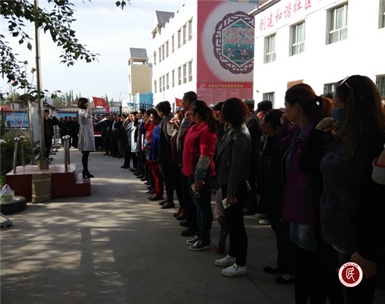 新疆民生网讯(通讯员  吴芳)4月17日,像往常一样,我们工作队再次参加了每周一例行的升国旗日。这是一个阳光明媚的早晨,伴随着广播里《我的祖国》优美的歌声响起,前来参加升国旗仪式的各族群众怀着激动的心情,自发在升旗台前排列成一行行整齐的队伍。院内飘着淡淡的梨花清香,场内人头攒动而不失秩序,群众们随着广播轻轻哼唱着发音不那么准确的歌曲,在两遍《没有共产党就没有新中国》播放结束后,古勒阿瓦提社区干部拿着名册开始点名,点到的群众也很配合的高声应到,一切都有条不紊的进行着。社区所有干部和工作队成员在社区书记李明的带领下站在了队伍的前排。10:00整准时开始了升旗仪式,国旗手由社区干部张兆辉担当。庄严的《中华人民共和国国歌》奏响时,国旗也徐徐升起,人们都挺起了脊梁和胸膛,神情或凝重,或激动,目光随着国旗一点点在升高,有的群众嘴里也轻声唱起了国歌。虽然只是短短一分半的国歌,但大家的内心都油然而生一股使命感和责任感。“爱我中华,爱我中国”,五十六个民族共系一心,共筑一个中国梦。