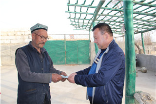 新疆民生网讯(通讯员 里红玲)4月17日,新疆阿克苏市教育局驻喀拉塔勒镇阿热博孜其村工作队逐一上门给 “四老人员”发放津贴,将党的关怀送到“四老”人员手中,让“四老人员”倍感温暖。