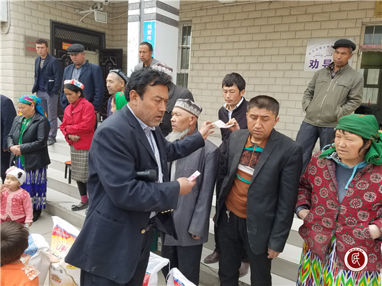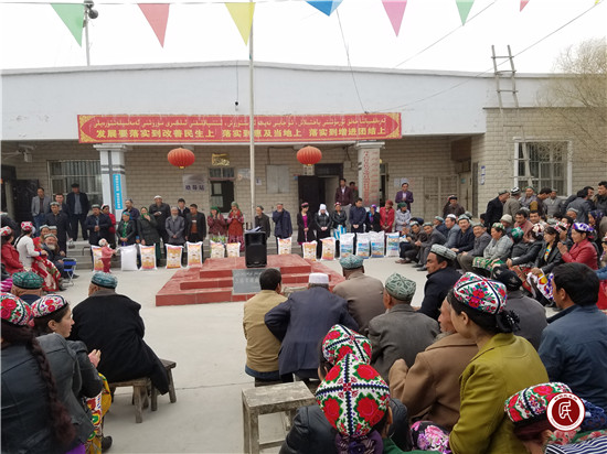 新疆民生网讯(通讯员 候宝宝)4月17日上午,在库木巴什乡托万克喀日纳斯村升旗仪式上,阿克苏市国土资源局驻村工作队队员、村干部及党员慰问本村贫困户,给他们送上了面粉及慰问金,把温暖送入群众心中,为贫困户度过春荒增添了一股新的力量,受到了当地干部群众的热烈欢迎。