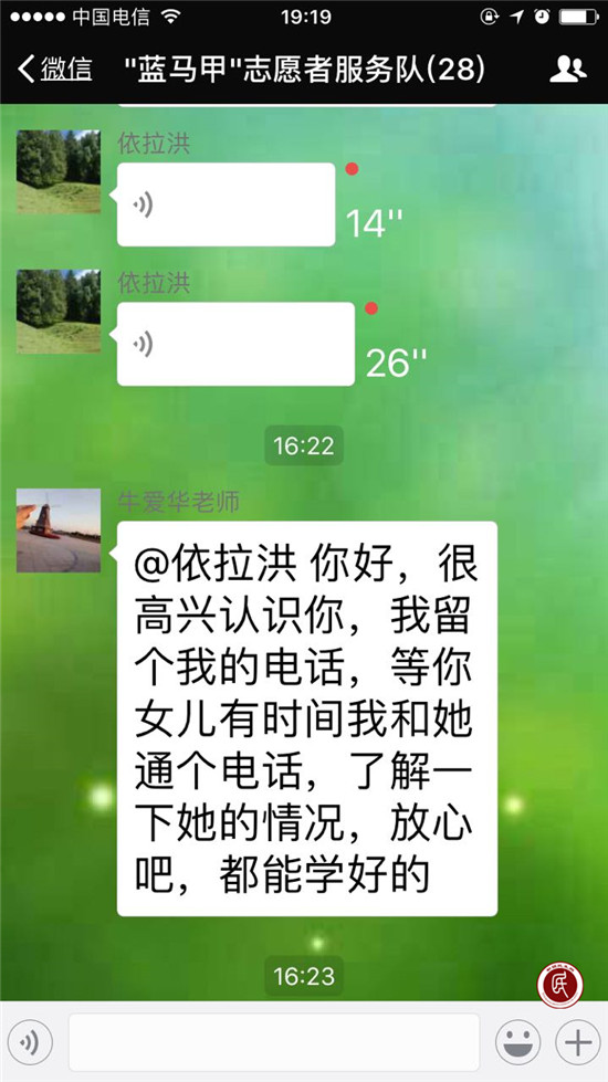 新疆民生网讯(通讯员 殷燕)麦迪娜依的妈妈操着不太熟练的汉语在奇台县坎尔孜乡东坎尔孜村“驻村妈妈”辅导班的微信群里用语音聊天对我们说:“老师你好!我是戴眼镜的女孩麦迪娜依的妈妈,孩子就交给你们了,麻烦你们了!”听着这位妈妈的郑重嘱托,每位工作队员的心里都充满了责任感和使命感!