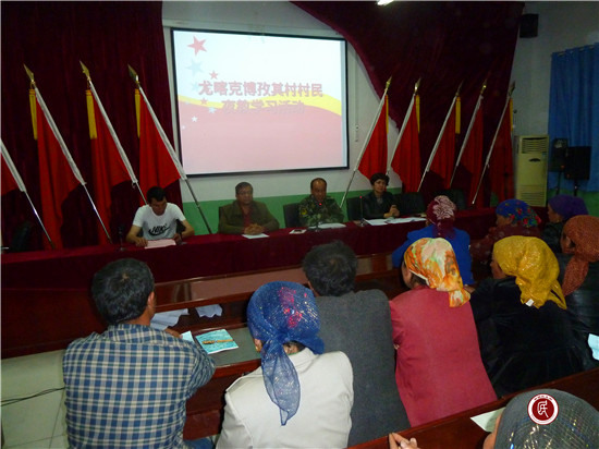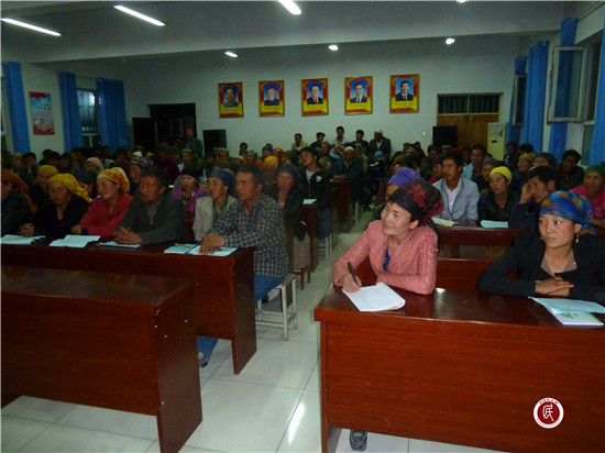 工作队队长买买提•买合木提号召村民们,让我们更加紧密地团结在以习近平同志为核心的党中央周围,认真落实“自治区党委九届二次全体(扩大)会议”精神,把党的各项惠民政策落到实处,巩固和发展民族团结,不忘初心,继续前行,以新疆稳定发展的优异成绩迎接党的十九大胜利召开。村民们报以热烈的掌声,表示坚决支持,并做好学习笔记。