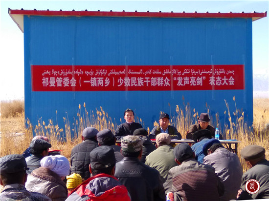 4月18日上午,祁曼管委会和驻村工作队在铁木里克乡夏草场上,借助转移牧场的契机,组织牧民召开了少数民族干部、群众“发声亮剑”表态大会。