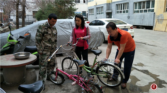 奇台县第一中学驻奇台县奇台镇崇文社区工作队在入户与莎车县来崇文社区务工的艾比比拉·艾力交流中了解到,由于宿舍在北斗宫社区,他每天要走路前往崇文社区工作,来回路程较远,又没有多余的钱乘坐交通工具,很是不便。“那就我们送你辆自行车吧。”工作队员潘存刚和再努热·吾普尔则热情地说。当工作队员们把两辆自行车送到艾比比拉·艾力宿舍时,他高兴地说,大的自行车他自己骑来上班,小的留给儿子,等儿子来了,看到这辆小自行车一定会特别喜欢。(奇台县第一中学驻奇台县奇台镇崇文社区工作队 潘存刚)
