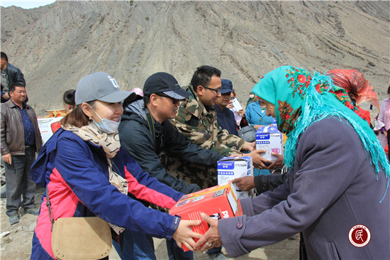 (图为:新疆能源集团驻乌恰县黑孜苇乡坎久干村工作队为牧民送上慰问品)