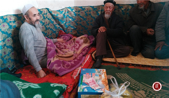新疆民生网讯 (通讯员 古力努尔巴拉提)2017年4月20日,阿克苏市执法局驻哈拉塔勒镇托万克萨提村工作队得知老党员麦麦提·麦米吐吾拉因病没有参加学习,便立即组织村党支部和工作队进行慰问,为他送上了党和政府的关心及慰问品、现金。