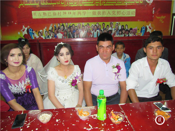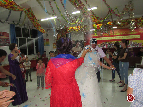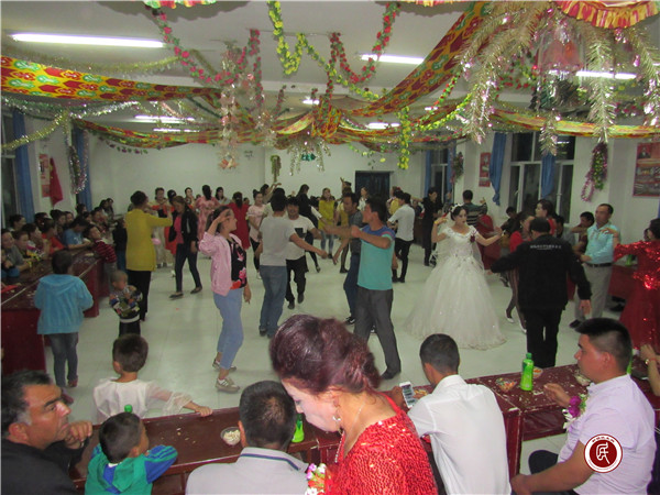 新疆民生网(马刚)2018年5月20日,阿克苏市就教育局驻喀拉塔勒镇英古勒巴格村工作队在村民服务中心为该村一对年轻人举办了一场隆重而简朴的婚礼,现场宾客满座,舞曲不断、热闹非凡,他们用优美的舞姿为一对新人送去了美好的祝福。当晚约100余人参加了婚礼。